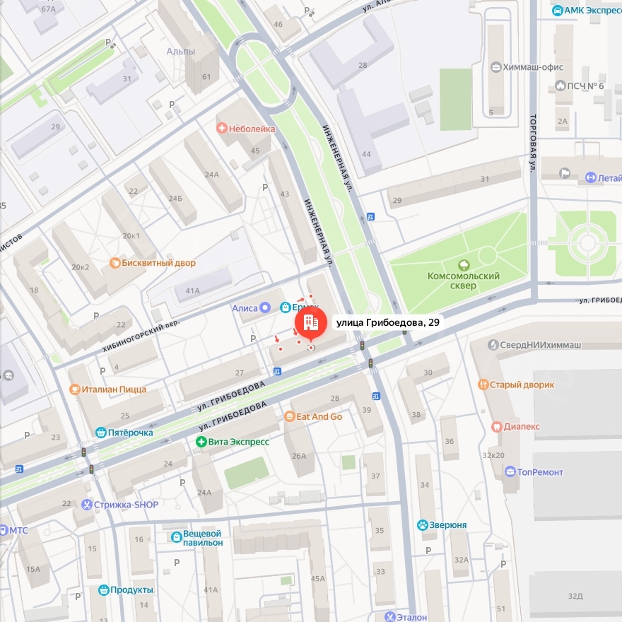 Адрес: Свердловская область, г. Екатеринбург, ул. Грибоедова, д. 29/ул. Инженерная, д. 41