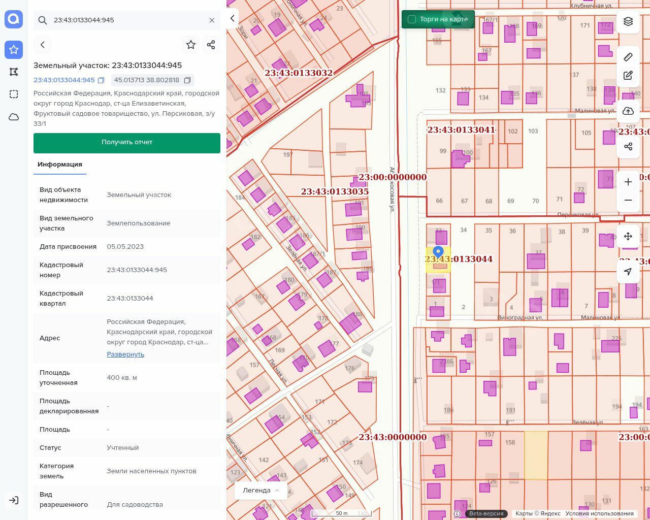 Земельный участок площадью 400,0 кв. метров, имеющий кадастровый номер 23:43:0133044:945, категория земель «Земли населенных пунктов», разрешенное использование «Для садоводства» («Земельный участок»)