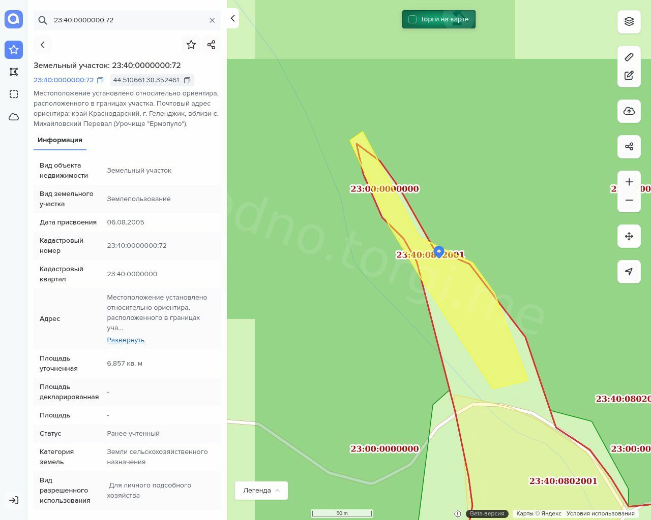 Земельный участок, общей площадью 6 857 м2, кадастровый (условный) номер: 23:40:0000000:72.