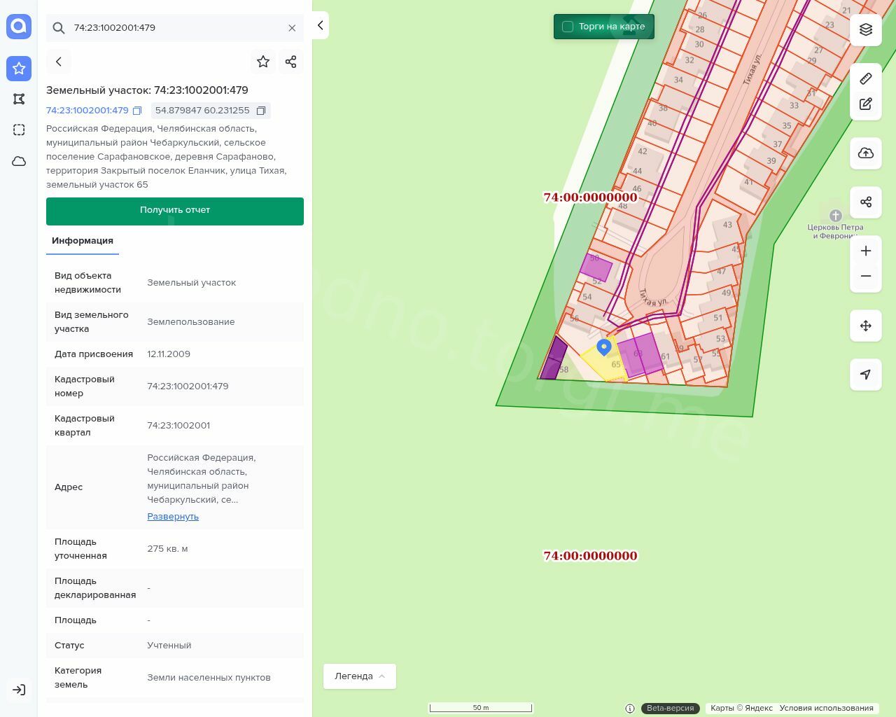 Адрес: Челябинская область, муниципальный район Чебаркульский, сельское поселение Сарафановское, деревня Сарафаново, территория Закрытый поселок Еланчик, улица Тихая, земельный участок 65