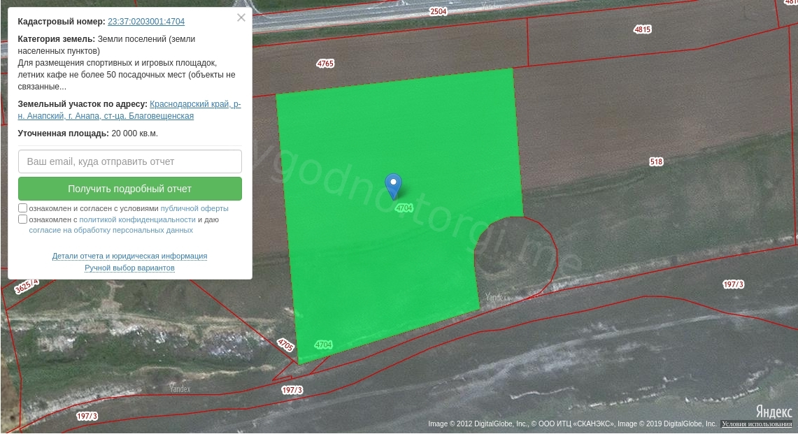 Лот №1. Земельный участок (для размещения спортивных площадок, летних кафе, торговых павильонов (не связанных со строительством). Площадь: 20000+/-49 м.кв. Кадастровый номер: 23:37:0203001:4704