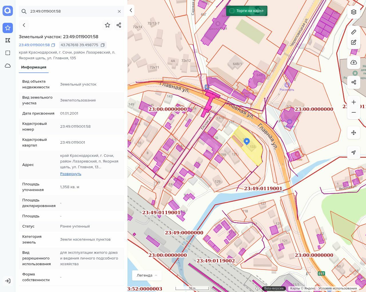 Земельный участок площадью 1 358 кв.м., категория земель: земли населенных пунктов, вид разрешенного использования: для эксплуатации жилого дома и личного подсобного хозяйства, кадастровый номер: 23:49:0119001:58