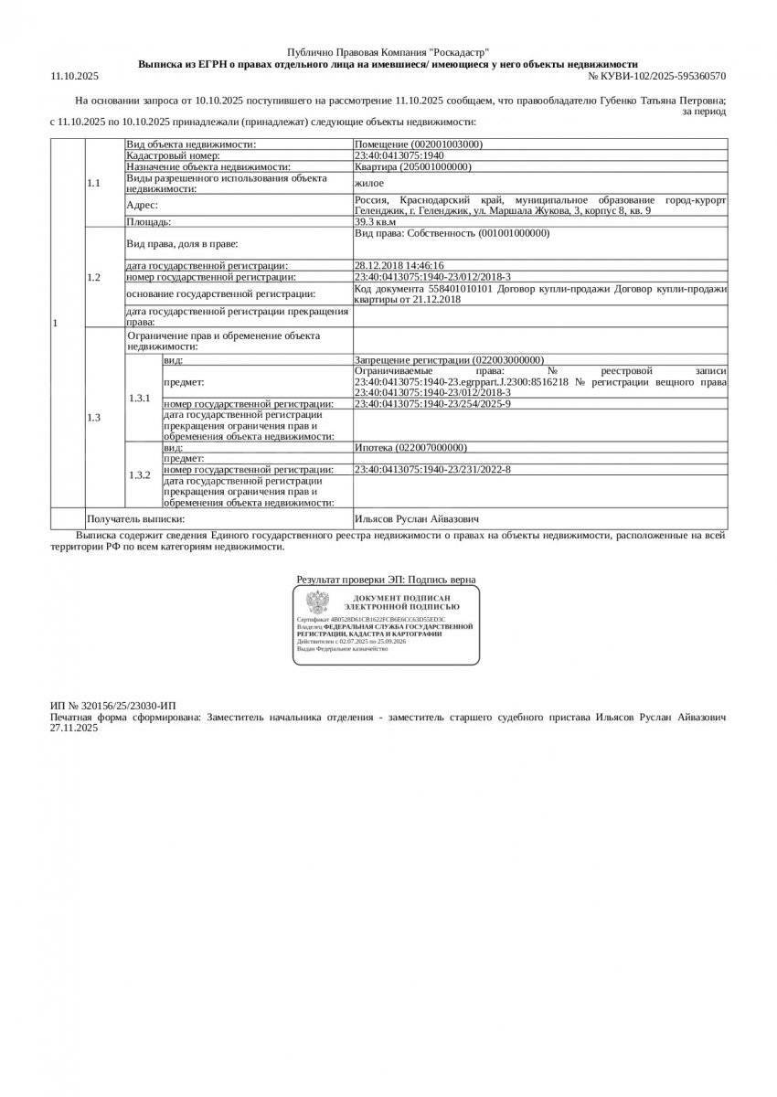 Д-к: Губенко Т.П. Жилое помещение, площадь 39,3 кв.м., кадастровый номер 23:40:0413075:1940., задаток 5 218 руб., шаг аукциона 52 176 руб., ув. 1902