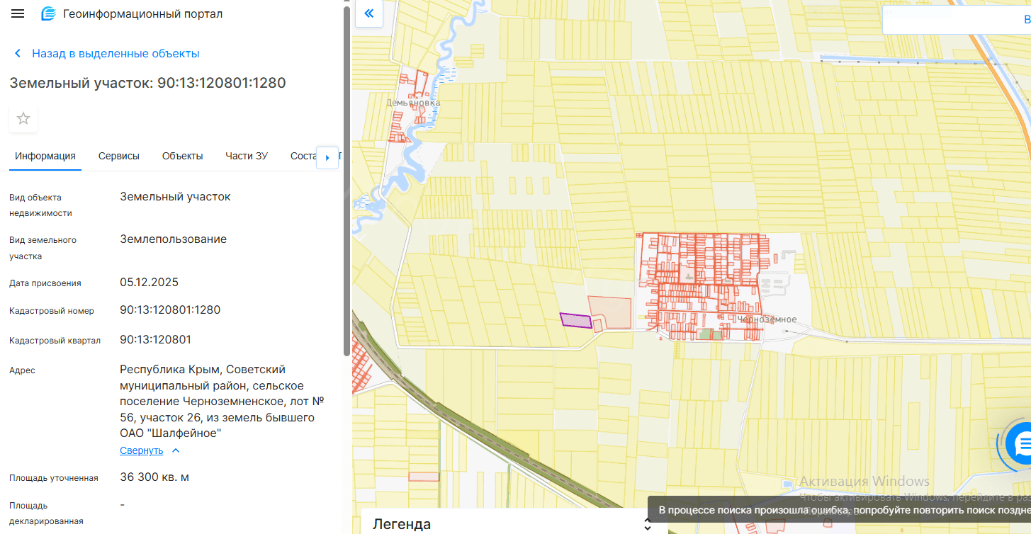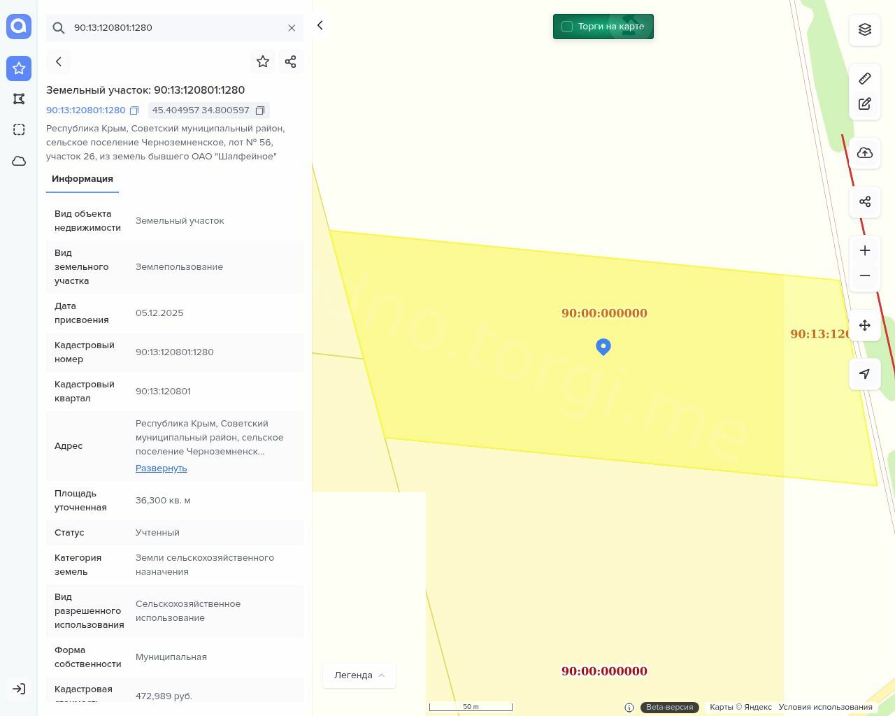 Земельный участок категории земель - земли сельскохозяйственного назначения, вид разрешенного использования - сельскохозяйственное использование, кадастровый номер: 90:13:120801:1280, площадь: 36 300 кв.м., местоположение: Республика Крым, Советский муниципальный район, сельское поселение Черноземненское, лот №56, участок 26, из земель бывшего ОАО «Шалфейное», находящийся в муниципальной собственности. Обременения/ограничения не установлены.