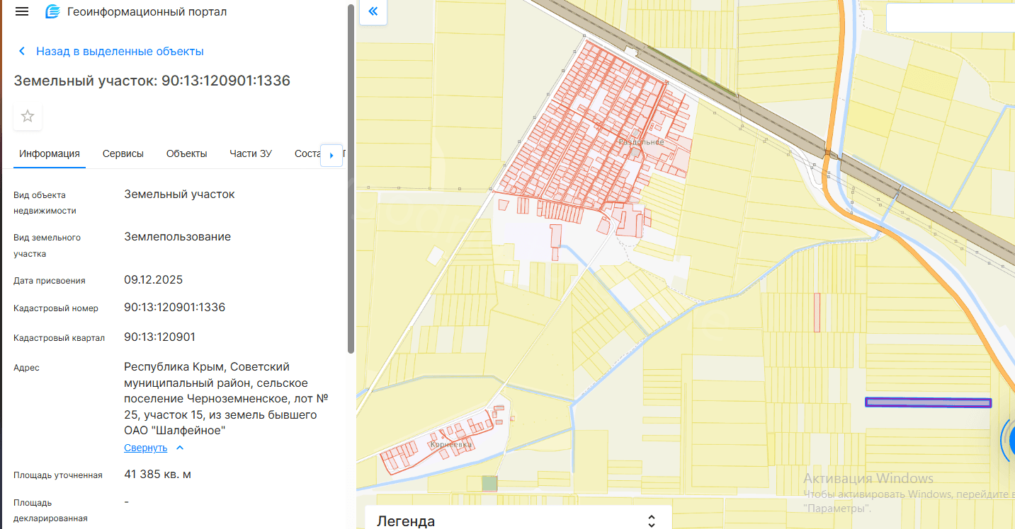 Земельный участок категории земель - земли сельскохозяйственного назначения, вид разрешенного использования - сельскохозяйственное использование, кадастровый номер: 90:13:120901:1336, площадь: 41 385 кв.м., местоположение: Республика Крым, Советский муниципальный район, сельское поселение Черноземненское, лот №25, участок 15, из земель бывшего ОАО «Шалфейное», находящийся в муниципальной собственности. Обременения/ограничения не установлены.