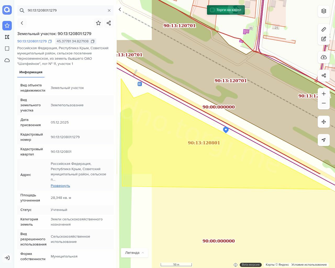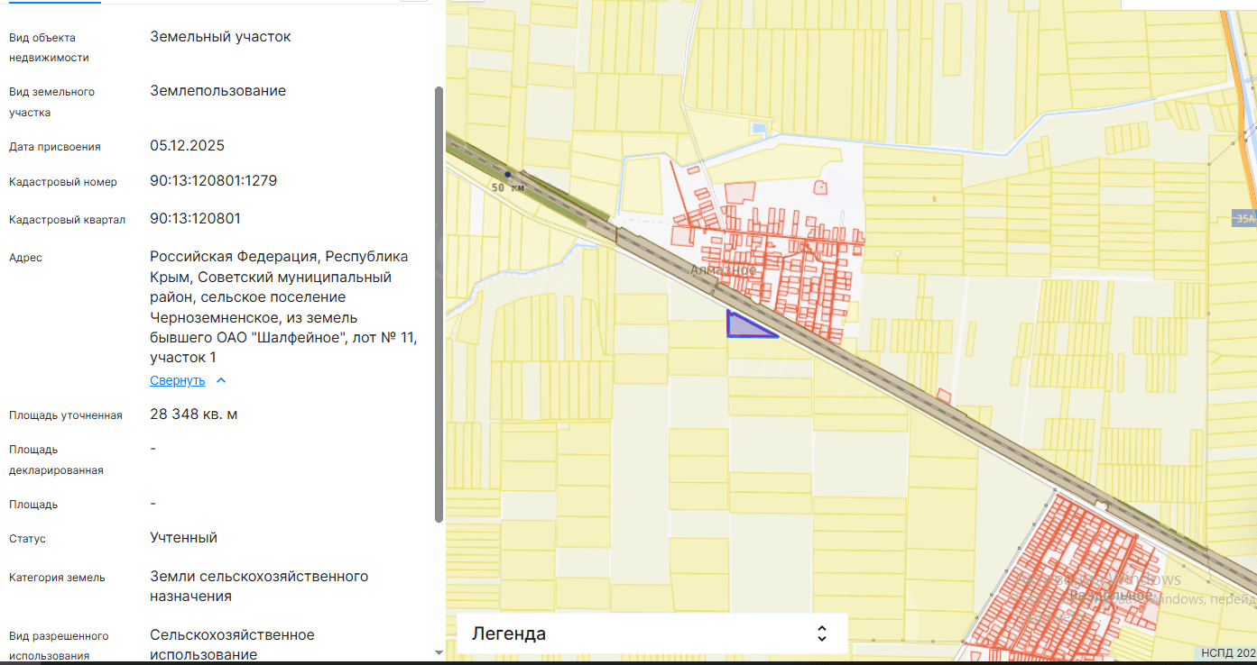 Земельный участок категории земель - земли сельскохозяйственного назначения, вид разрешенного использования - сельскохозяйственное использование, кадастровый номер: 90:13:120801:1279, площадь: 28 348 кв.м., местоположение: Республика Крым, Советский муниципальный район, сельское поселение Черноземненское, из земель бывшего ОАО «Шалфейное», лот №11, участок 1, находящийся в муниципальной собственности. Обременения/ограничения не установлены.