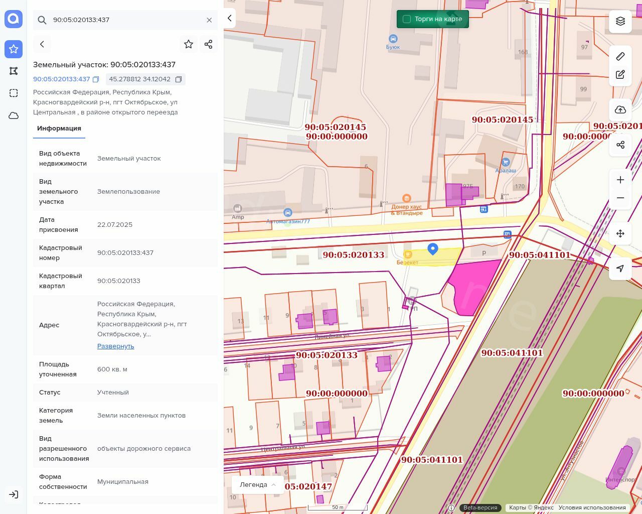 Земельный участок, кадастровый номер 90:05:020133:437, площадью 600 +/- 9 кв. м, категория земель – земли населённых пунктов, разрешенное использование – объекты дорожного сервиса, расположенный по адресу: Российская Федерация, Республика Крым, Красногвардейский район, пгт. Октябрьское, ул. Центральная, в районе открытого переезда