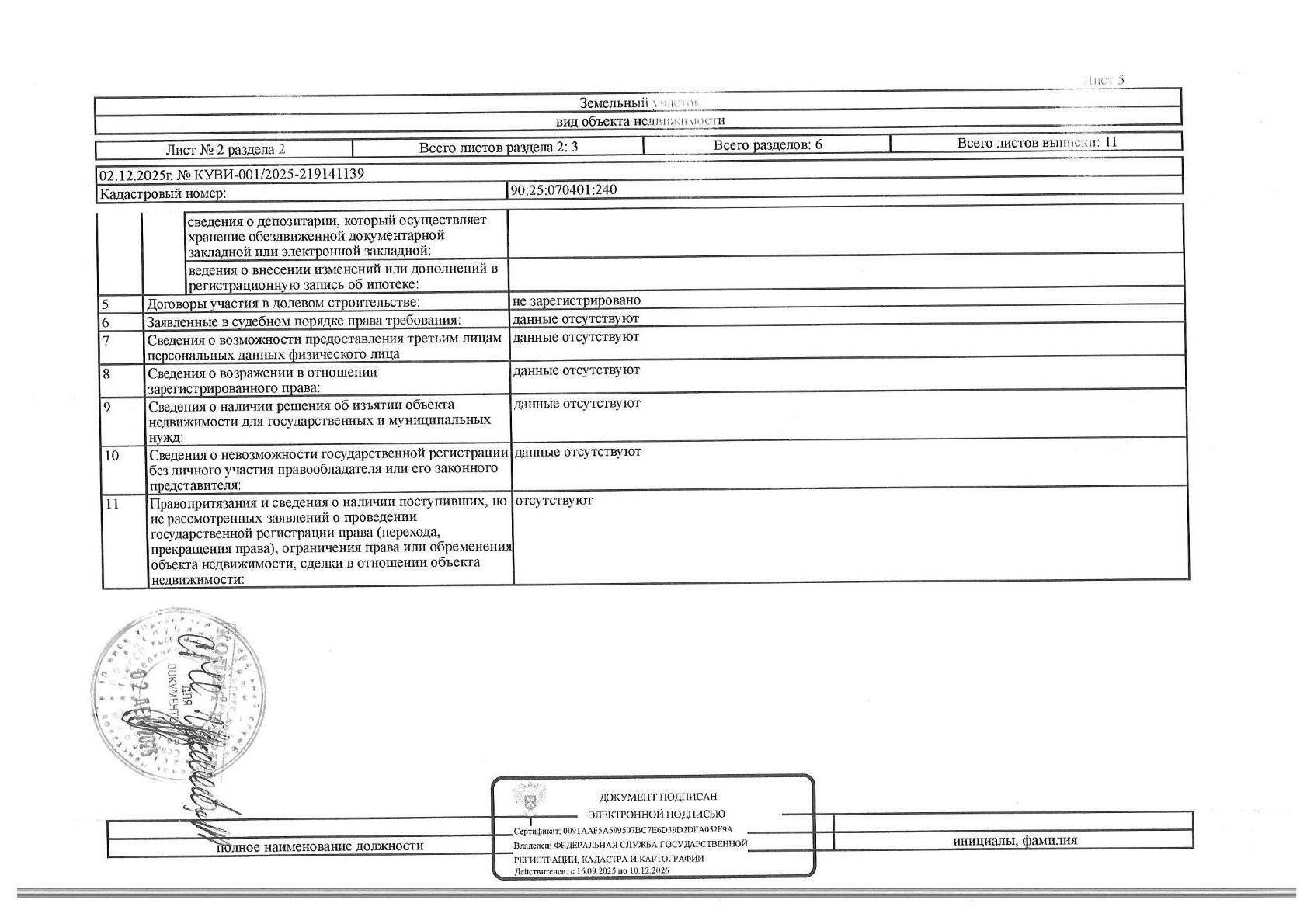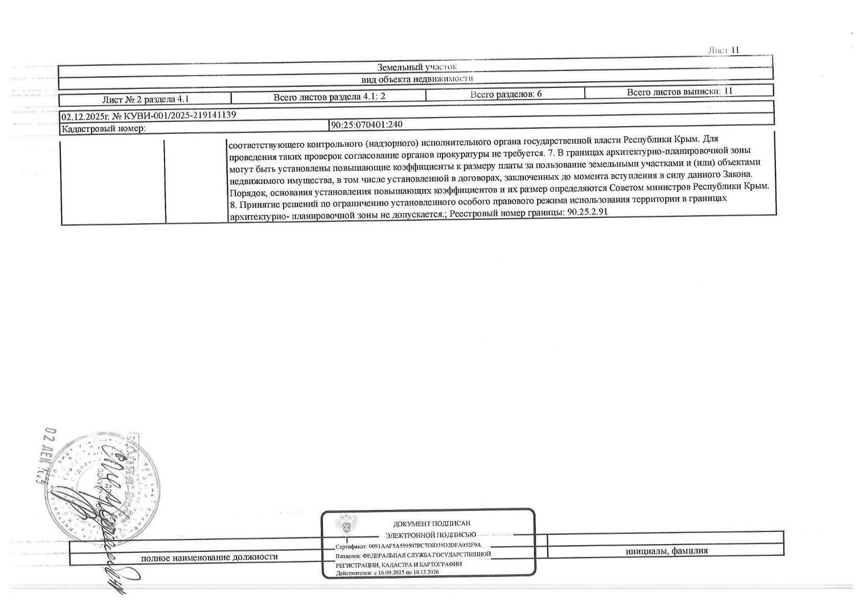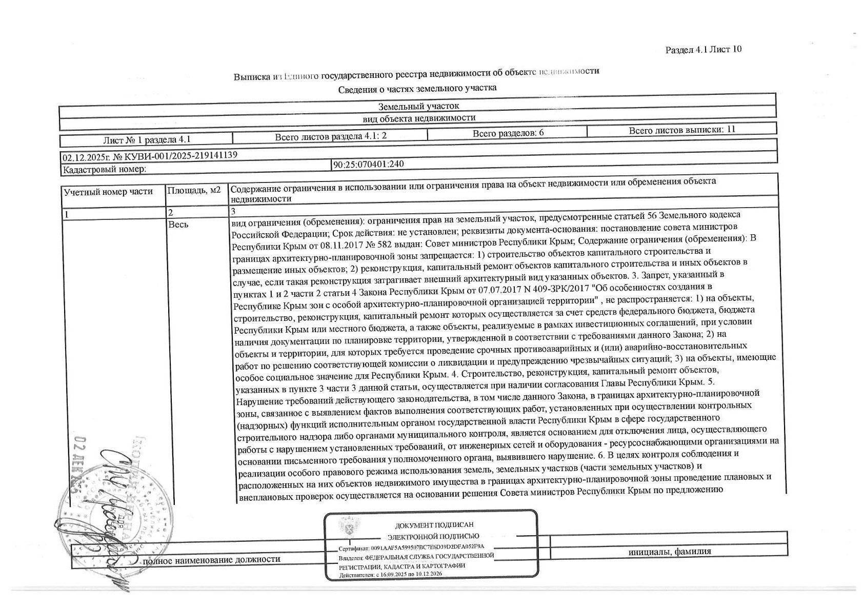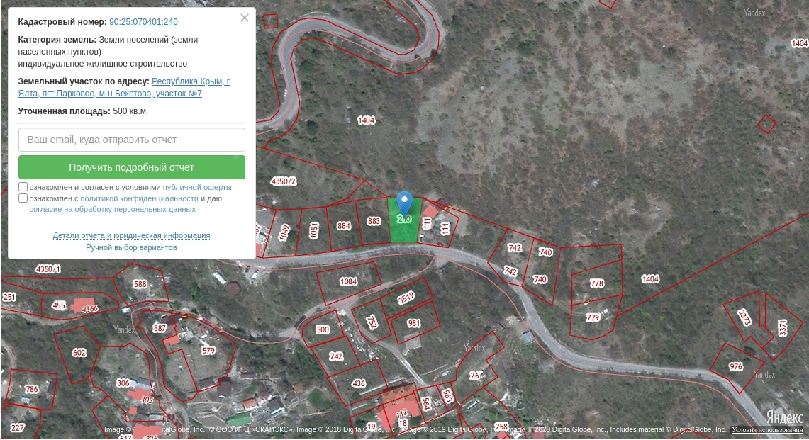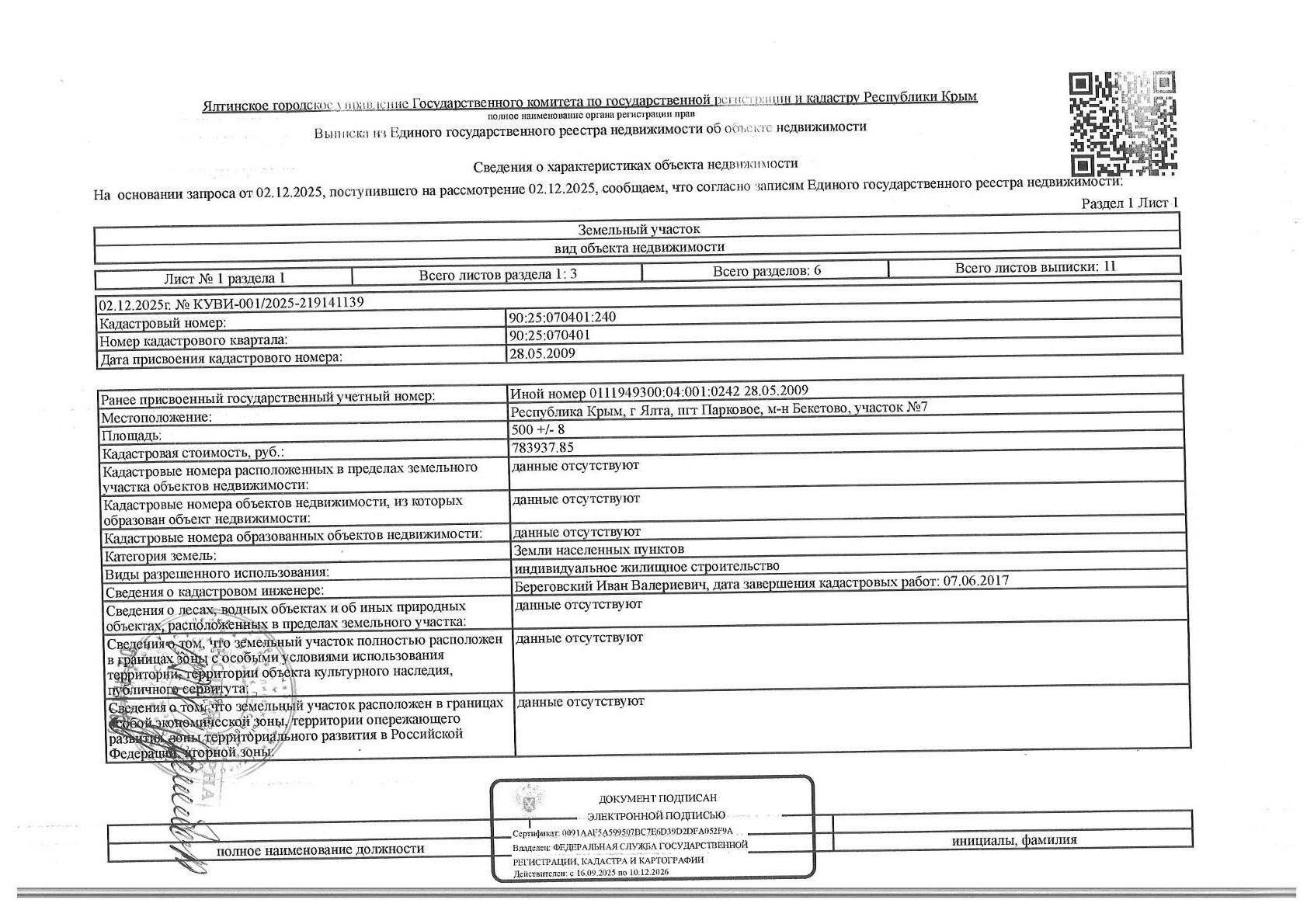 Земельный участок, расположенный по адресу: Республика Крым, г. Ялта, пгт. Парковое, м-н Бекетово, участок №7, кадастровый номер 90:25:070401:240, площадью 500+/-8 кв.м., земли населенных пунктов. На земельном участке имеются ограничения, в т.ч. предусмотренные ст. 56 ЗК РФ.
