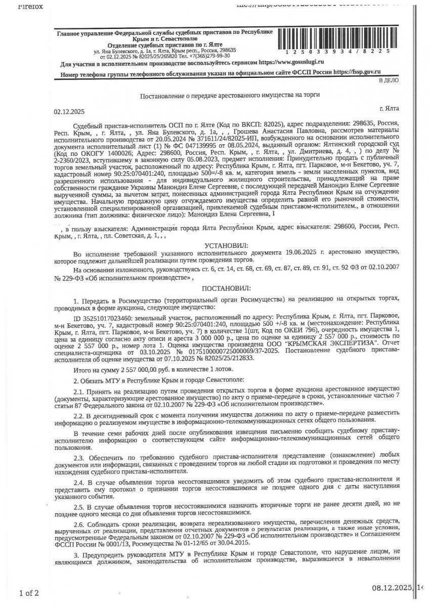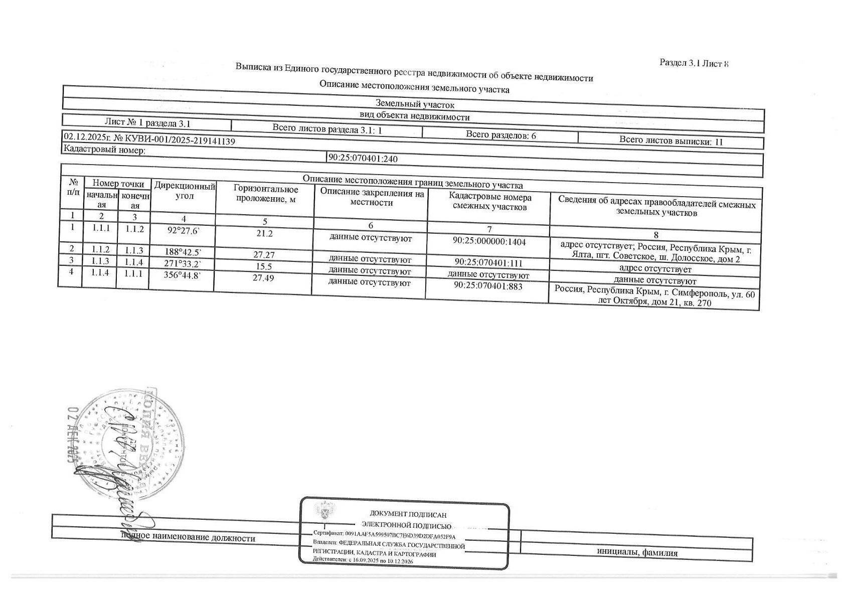 Местонахождение имущества: Респ Крым, м.о. город-курорт Ялта, пгт Парковое м-н Бекетово, участок №7