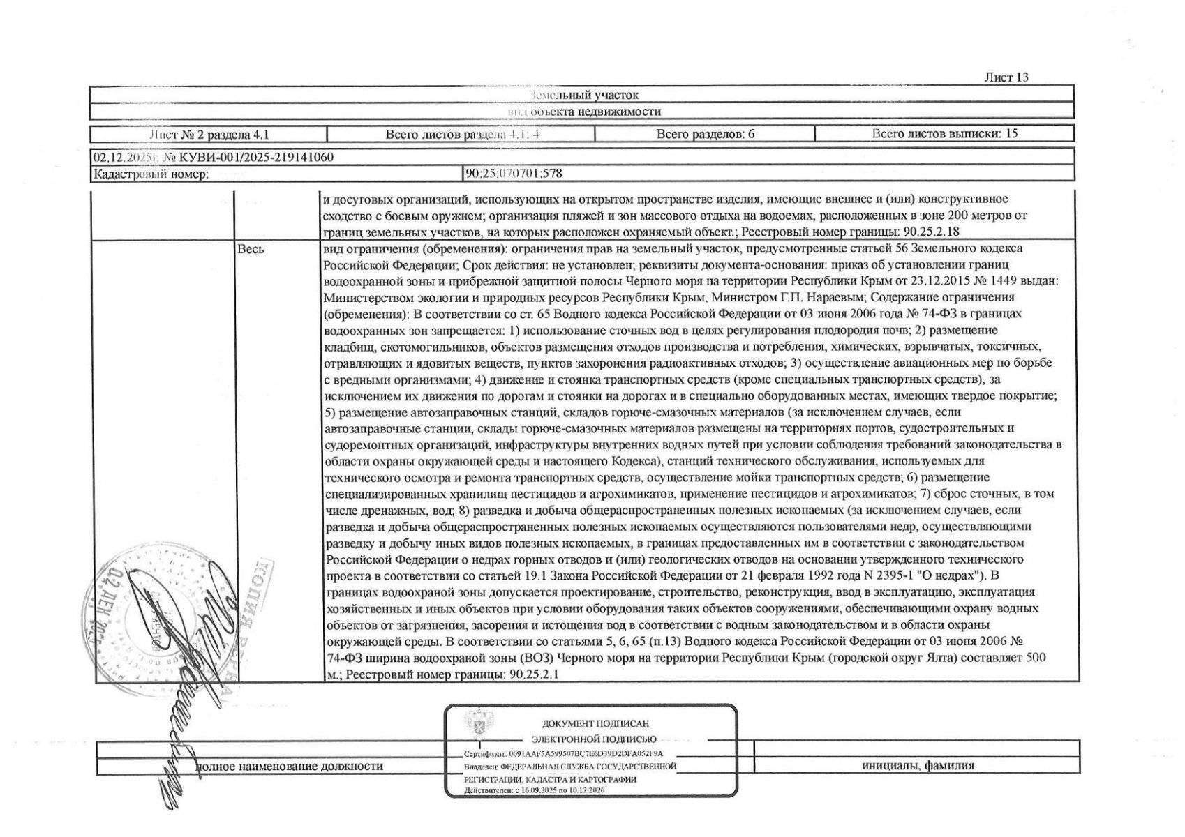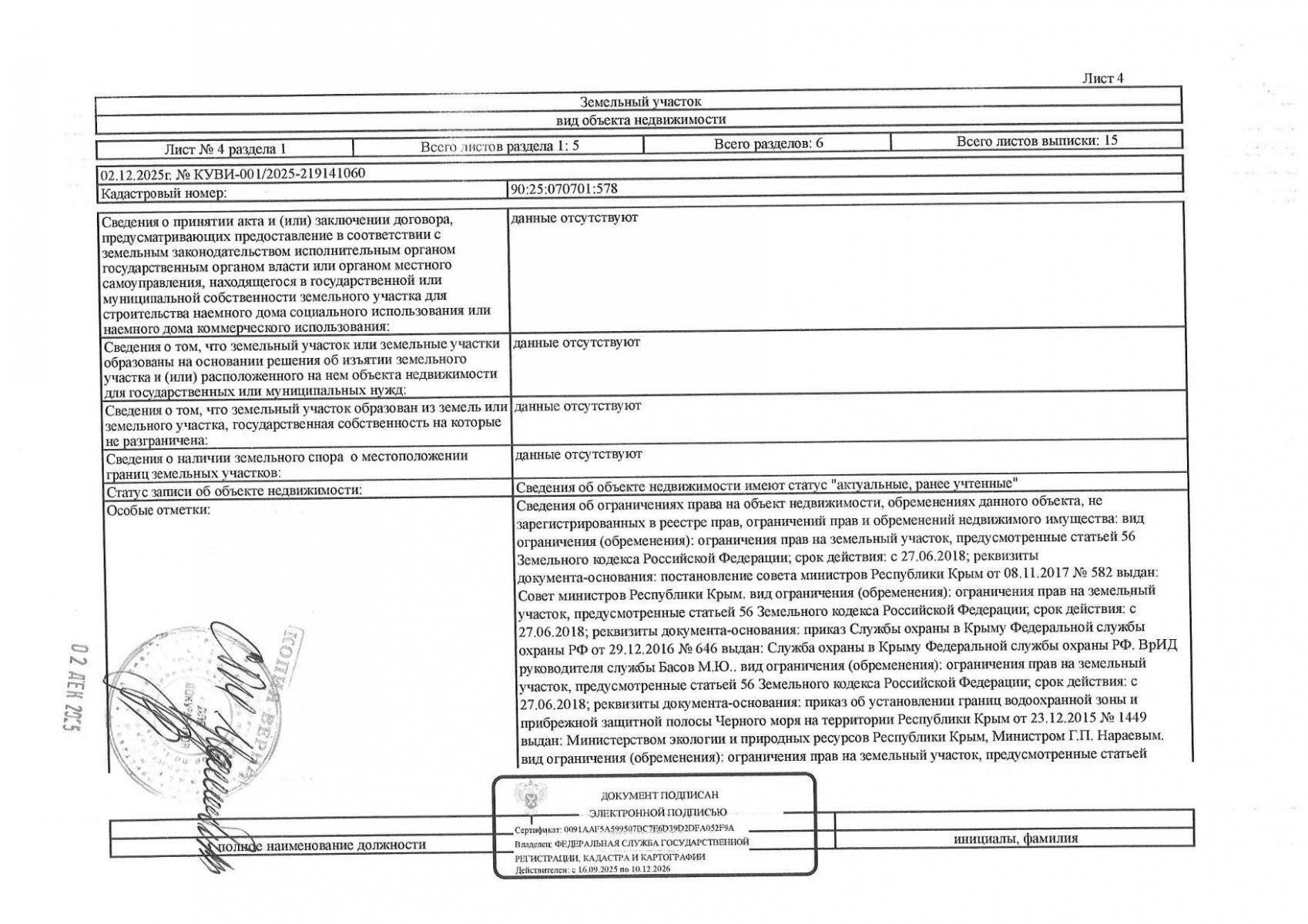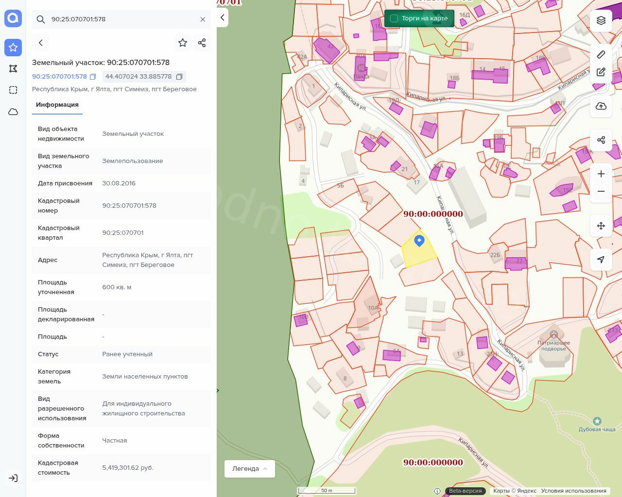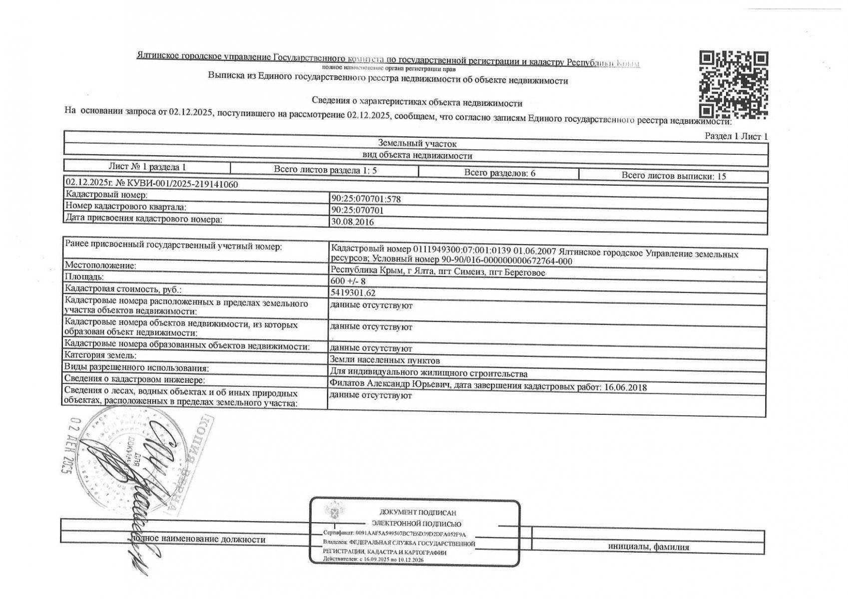 Земельный участок, расположенный по адресу: Республика Крым, г. Ялта, пгт. Симеиз, пгт. Береговое, кадастровый номер 90:25:070701:578, площадью 600+/-8 кв.м., земли населенных пунктов, вид разрешенного использования – для индивидуального жилищного строительства. На земельном участке имеются ограничения, в т.ч. предусмотренные ст. 56 ЗК РФ.