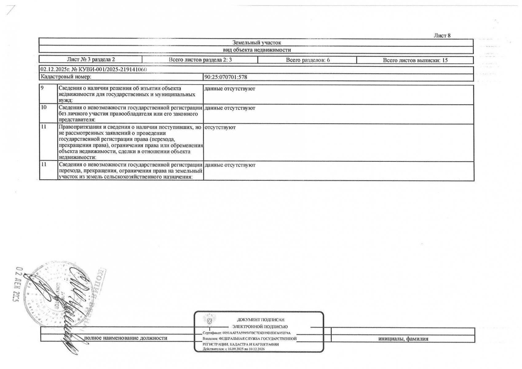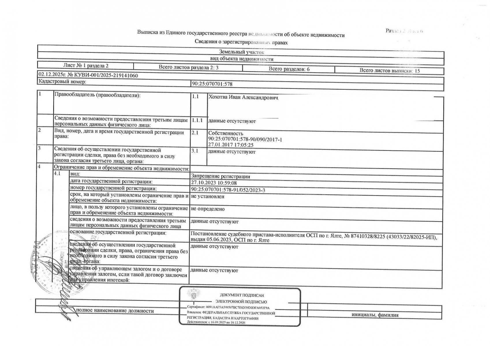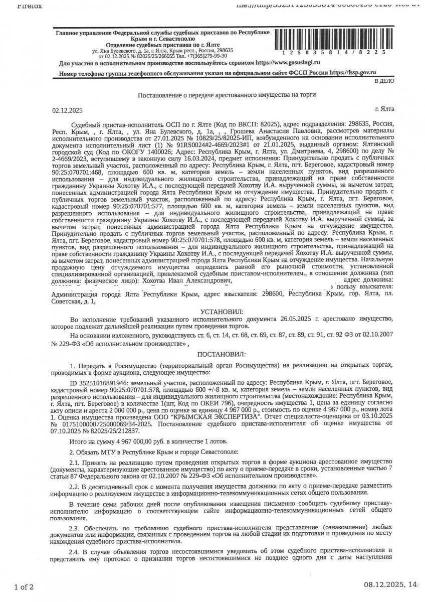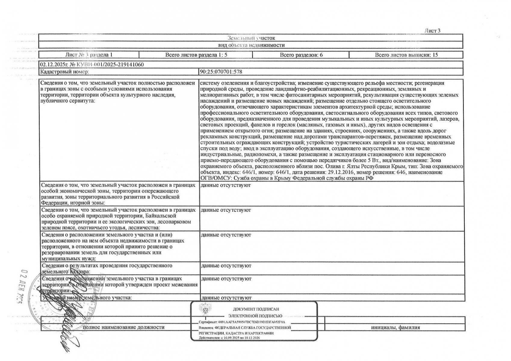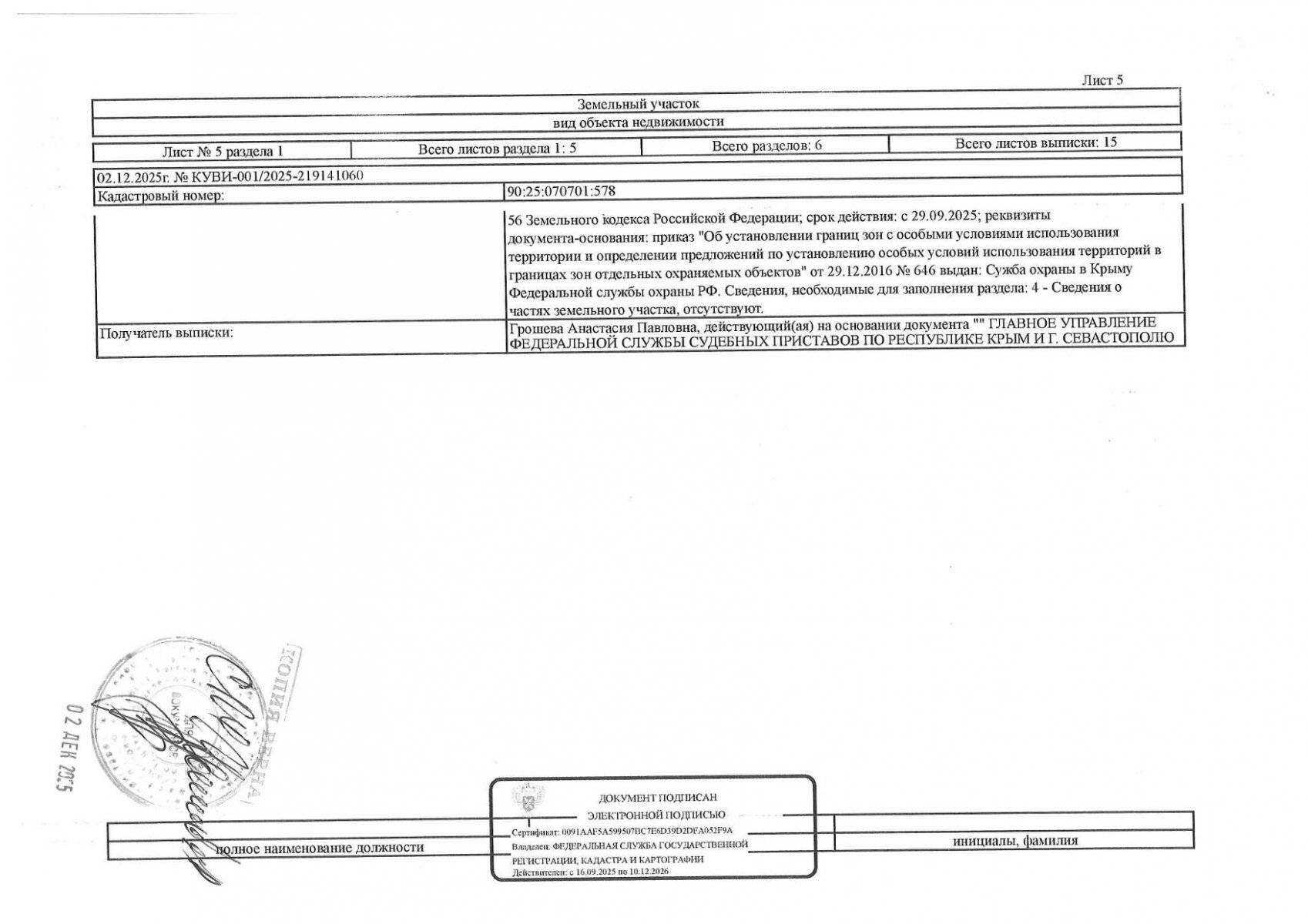 Земельный участок, расположенный по адресу: Республика Крым, г. Ялта, пгт. Симеиз, пгт. Береговое, кадастровый номер 90:25:070701:578, площадью 600+/-8 кв.м., земли населенных пунктов, вид разрешенного использования – для индивидуального жилищного строительства. На земельном участке имеются ограничения, в т.ч. предусмотренные ст. 56 ЗК РФ.