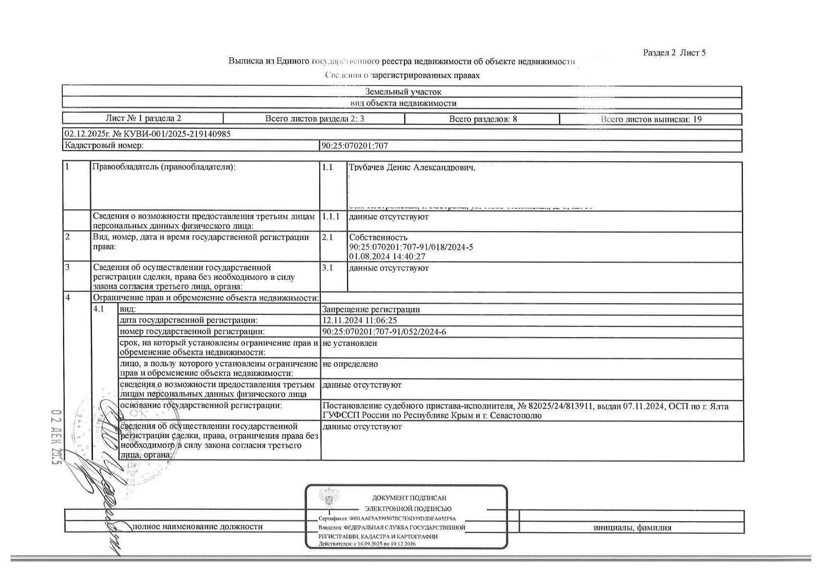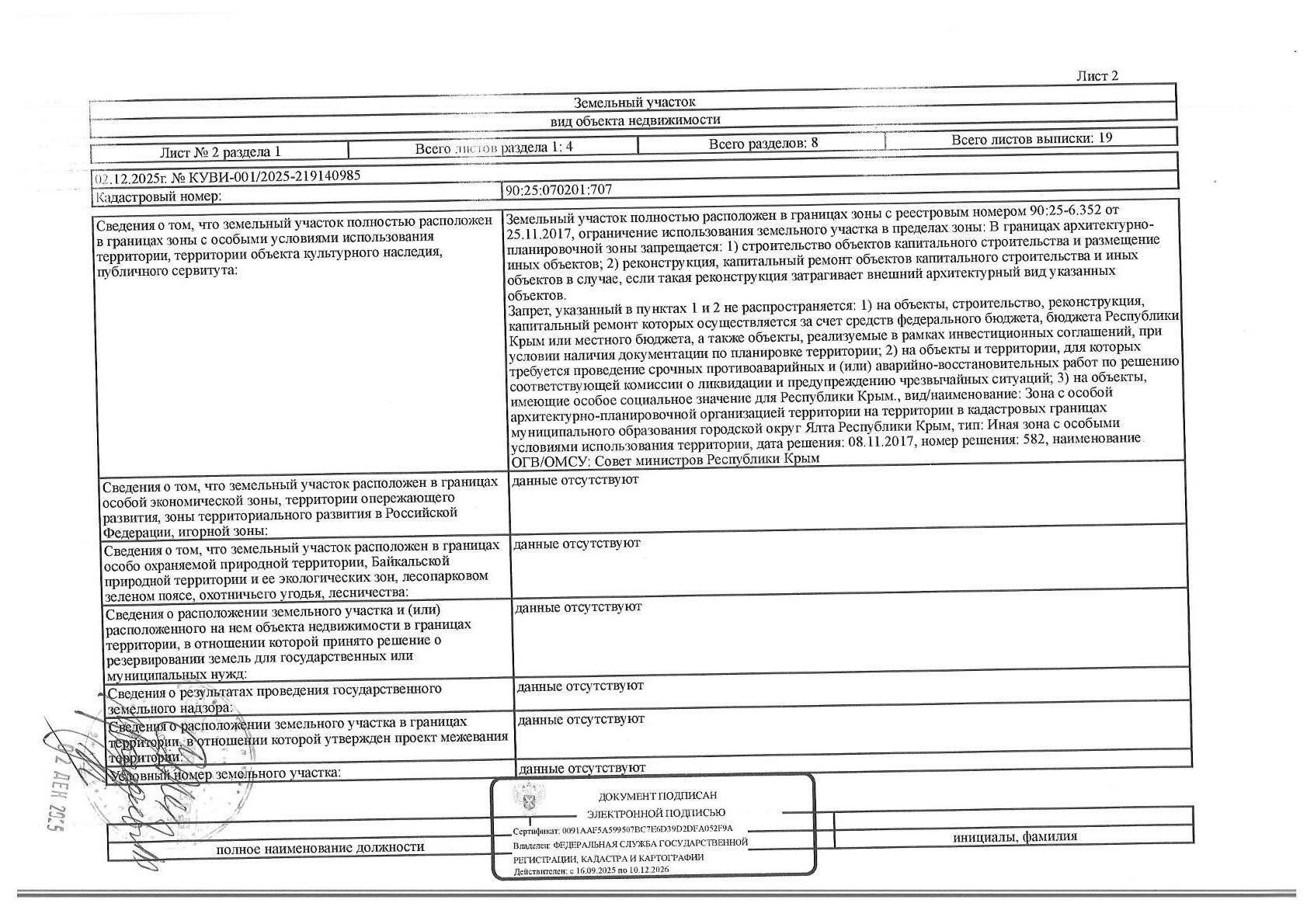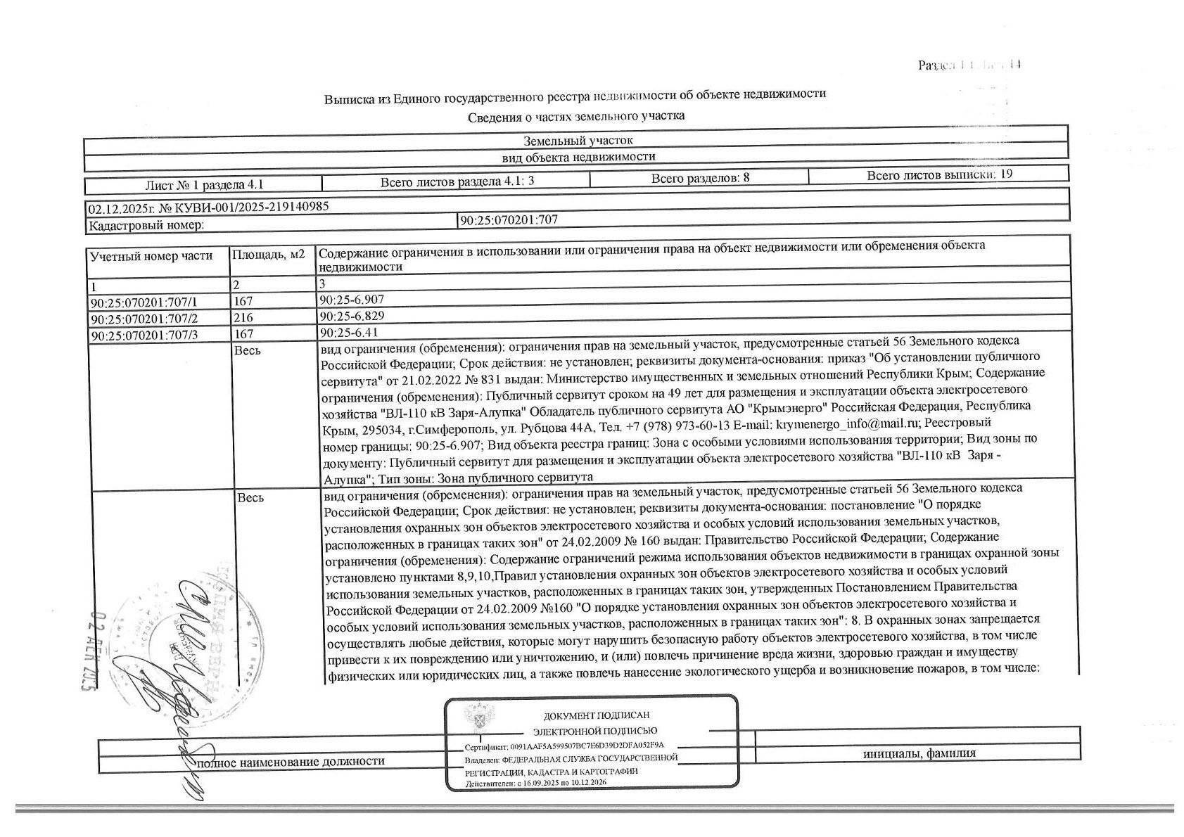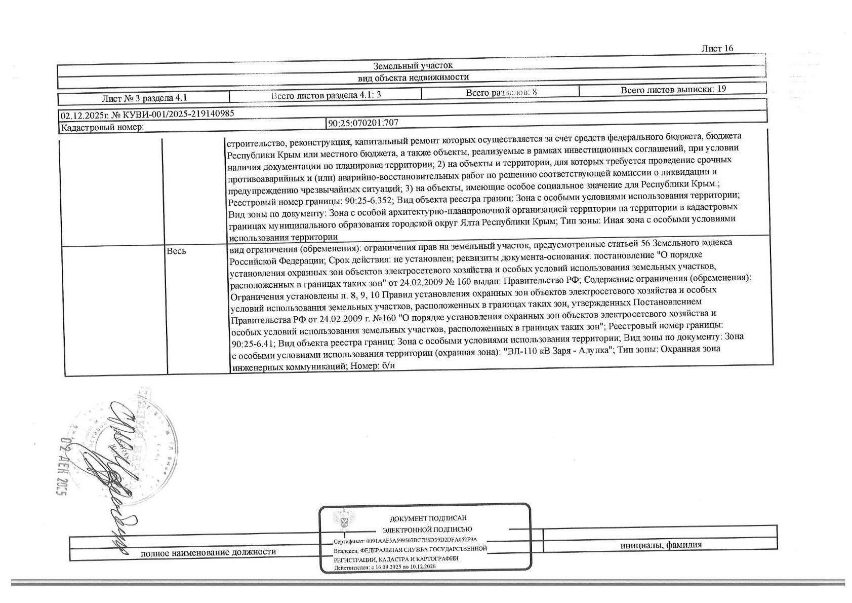 Земельный участок, земли населенных пунктов, кадастровый номер 90:25:070201:707, площадью 540+/-8 кв.м., расположенный по адресу: Республика Крым, г. Ялта, с. Оползневое, мкр. Зори России-2, уч. 11. На земельном участке имеются ограничения, в т.ч. предусмотренные ст. 56 ЗК РФ.