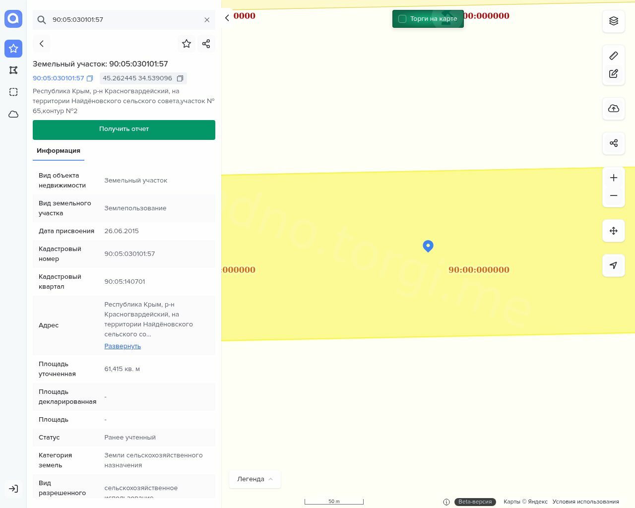 Земельный участок, кадастровый номер 90:05:030101:57, общей площадью – 61415 +/- 87 кв. м, виды разрешенного использования объекта недвижимости: сельскохозяйственное использование.