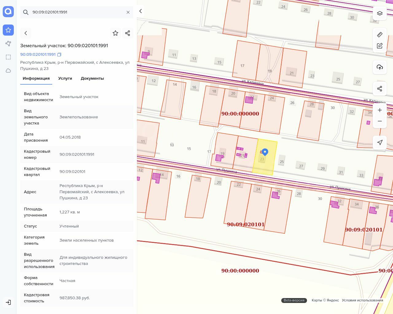 Земельный участок, кадастровый номер: 90:09:020101:1991, виды разрешенного использования объекта недвижимости: для индивидуального жилищного строительства, площадь: 1227 +/- 12, - Находящееся на нем Здание, кадастровый номер: 90:09:020101:1098, назначение объекта недвижимости: Жилое, виды разрешенного использования объекта недвижимости: Жилое, местоположение: Республика Крым, р-н. Первомайский, с. Алексеевка, ул. Пушкина, д. 23, площадь: 44.3, вид права, доля в праве: Собственность, - Сооружение, кадастровый номер: 90:09:020101:1896, назначение объекта недвижимости: Иное сооружение, местоположение: Республика Крым, р-н. Первомайский, с. Алексеевка, ул. Пушкина, д. 23, площадь: 7.7, вид права, доля в праве: Собственность.