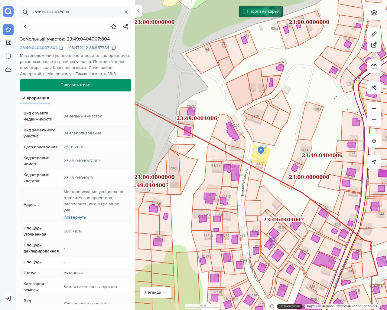 Земельный участок площадью 500 кв. м. – земли населенных пунктов для ведения личного подсобного хозяйства с кадастровым номером 23:49:0404007:804,