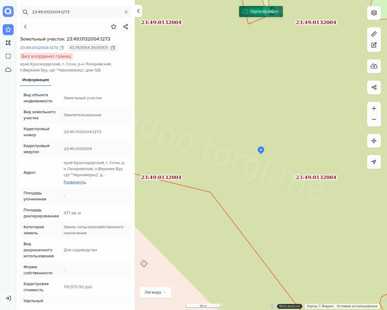 Земельный участок с кадастровым №23:49:0132004:1273, площадь 477 кв.м.; категория земель: земли сельскохозяйственного назначения; виды разрешённого использования: для садоводства.